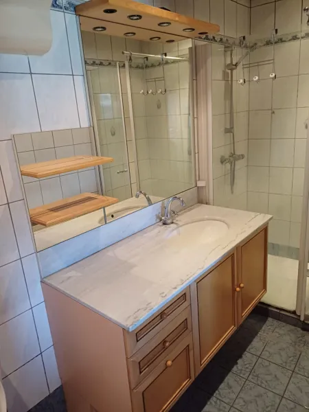 Et une nouvelle salle de bain de réalisée en partenariat avec Gedimat . Renovation totale :Électricité Plomberie Pose de faïence Pose de panneaux muraux Ameublement Pose de vinyle au sol Très beau choix des produits par les clients , le rendu est très joli